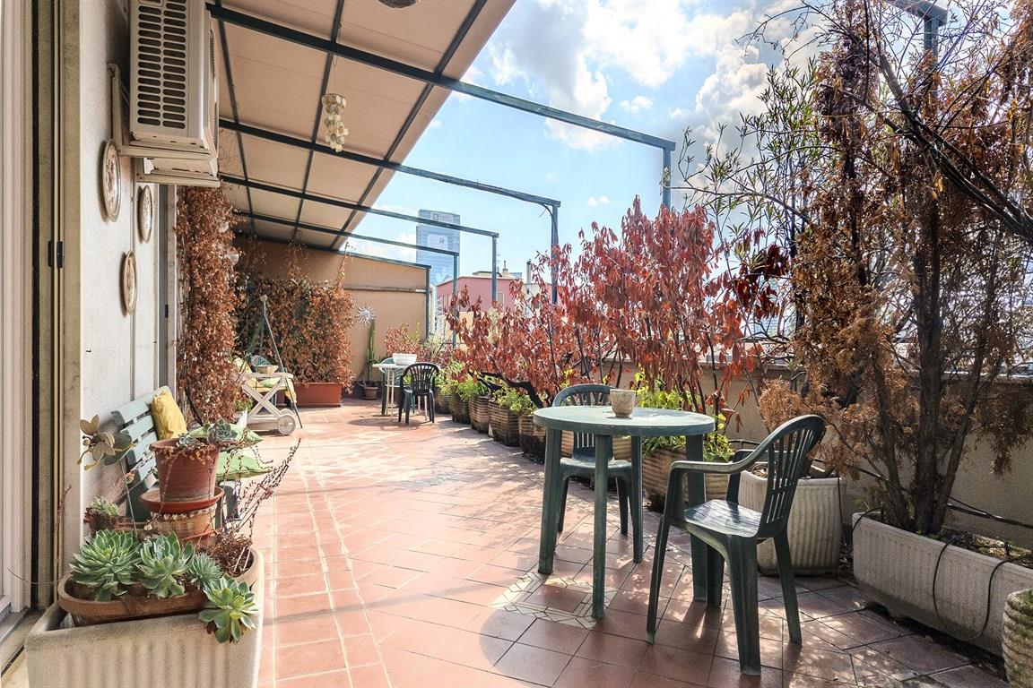 L'attico è unico nel suo genere e gode di una doppia esposizione, a sud ovest, dove c'è il terrazzo e a nord est, il che rende l'abitazione e lo splendido terrazzo vivibile a ogni ora del giorno. Entrando nell'appartamento saremo accolti da uno spazioso ingresso dotato di porta blindata, tramite il quale si può accedere direttamente al soggiorno, alla cucina abitabile o alla veranda condonata, che da sul terrazzo, dotata di finestrature su due lati, che la rendono un'ottima seconda zona living vista la metratura o un fantastico studio affacciato sul panorama milanese. Il soggiorno è molto luminoso e ampio, ha una doppia porta finestra lato terrazzo ed è dotato di aria condizionata (freddo e caldo) tramite split, posta recentemente. Successivamente troviamo il bagno finestrato, la camera matrimoniale e la seconda camera entrambe con accesso al terrazzo tramite porta finestra. Tutti gli infissi dell'abitazione sono in pwc, doppio vetro di ottima qualità, dotati di allarme anti-intrusione Verisure.